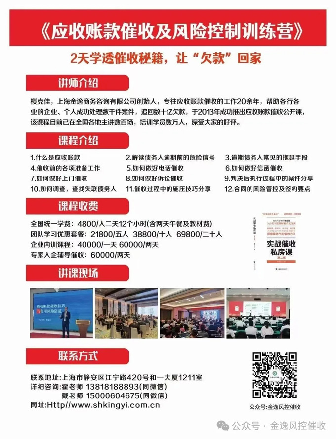 为期2天12小时的《企业应收账款催收与风险防控》培训已顺利落幕。接下来,将深入企业开展调研、评估与分析工作,针对具体逾期案件提供一对一指导服务。 下月课程安排已确定:16-17日于杭州、23-24日于成都开课,期待与更多企业深入交流。